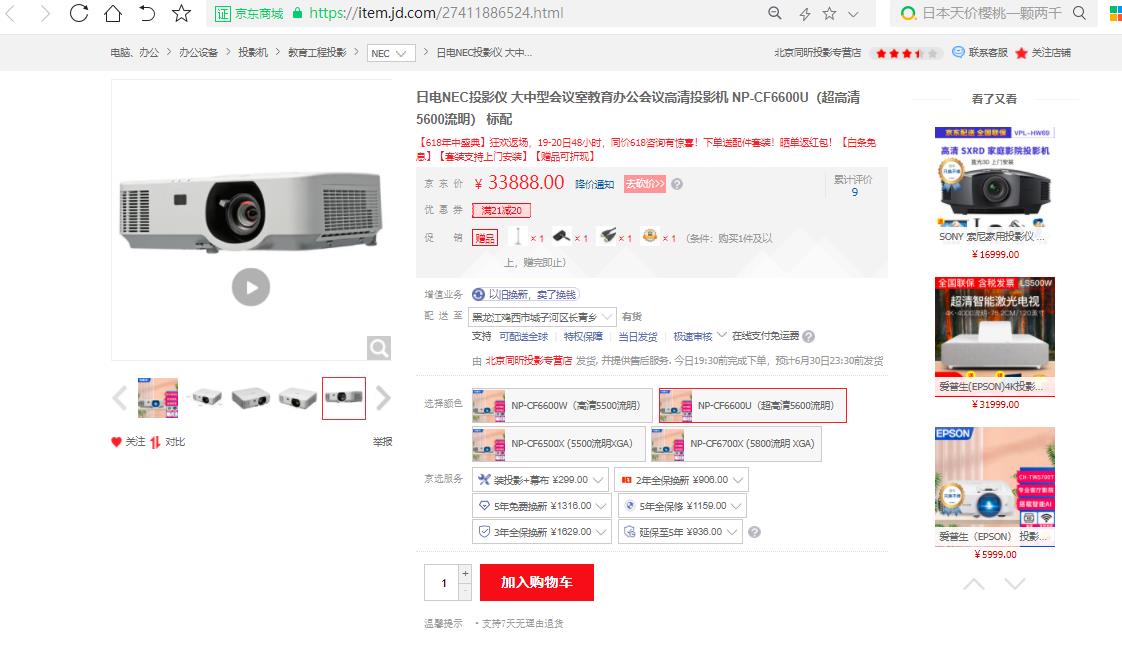 商品名称:日电NEC投影仪 大中型会议室教育办公会议高清投影机 NP-CF6600U(超高清5600流明) 标配
