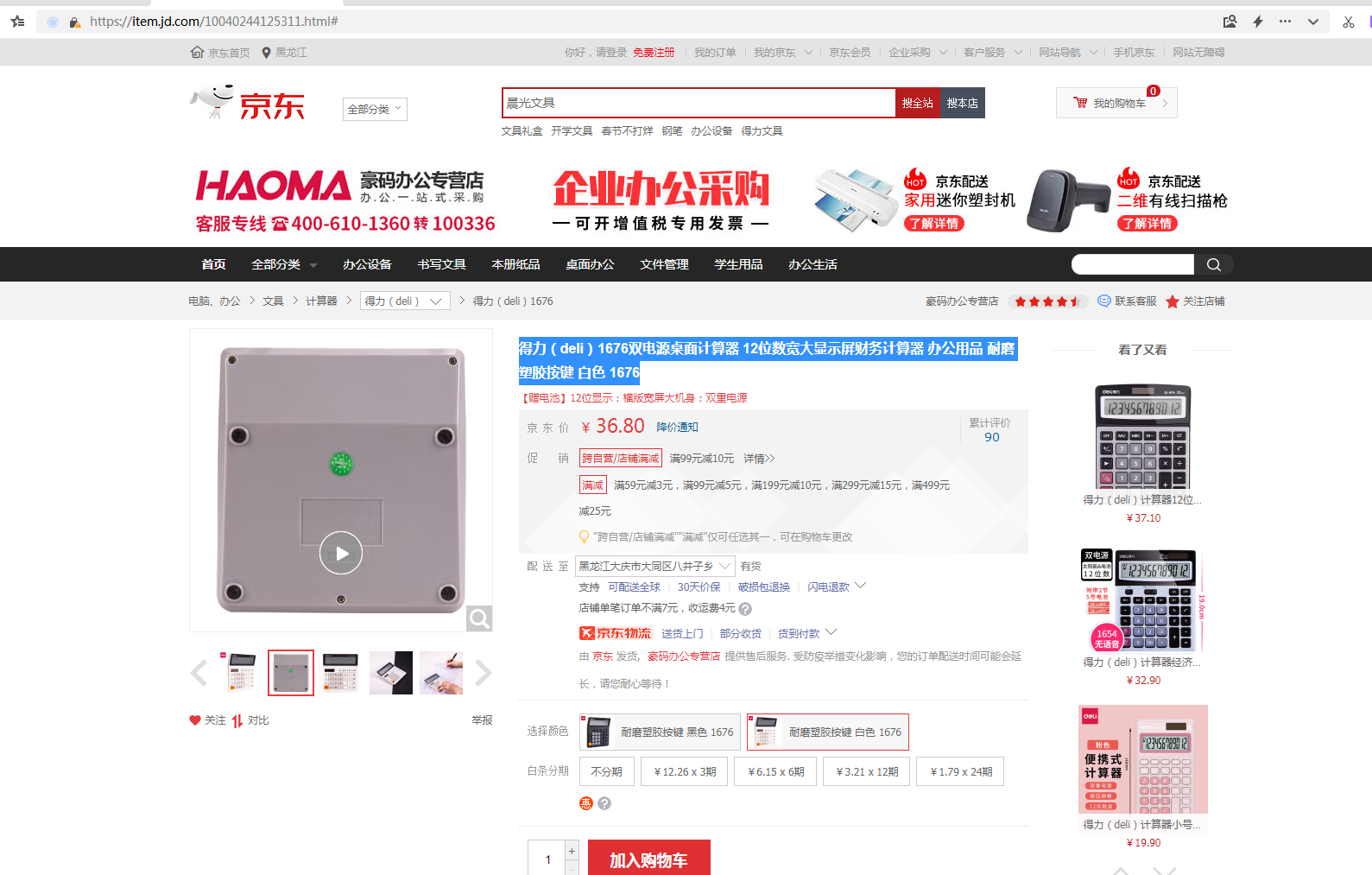 商品名称:得力(deli)双电源电脑按键计算器 12位大屏横式桌面计算机 财务及银行人员适用 办公用品 白色2136