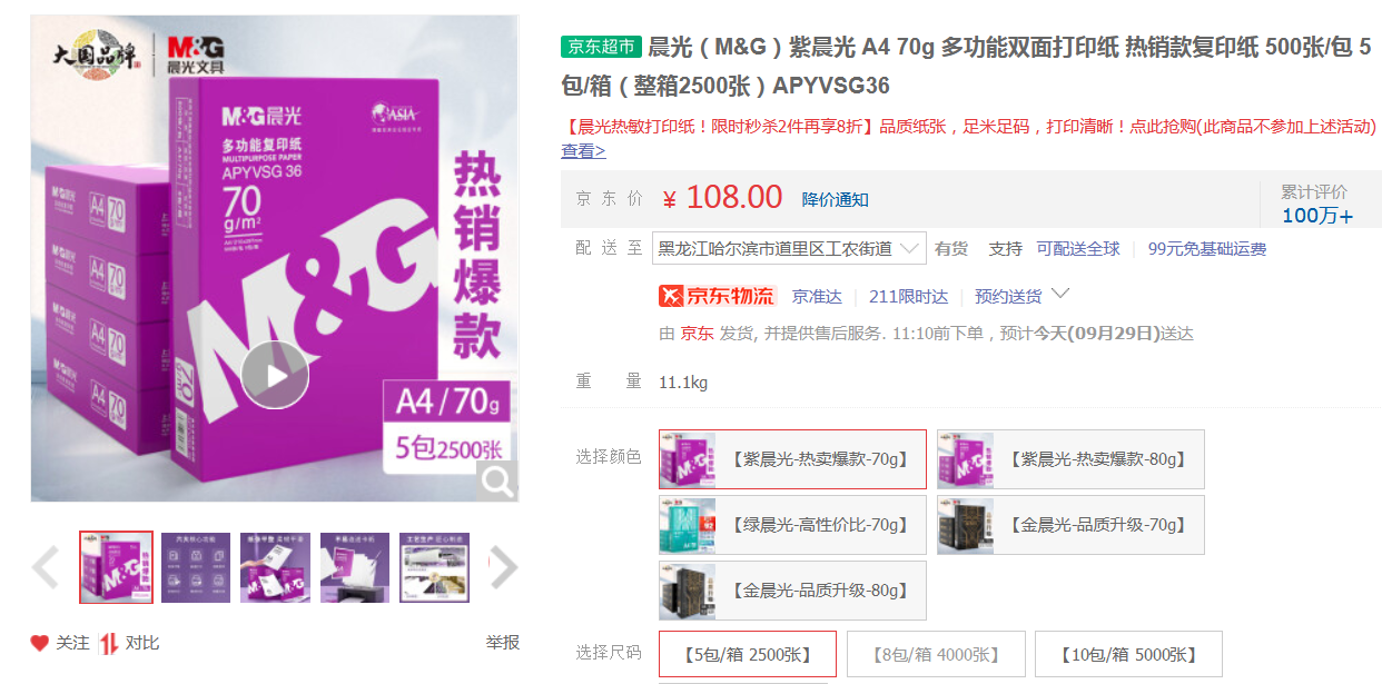 商品名称:晨光紫晨光 A4 70g 多功能双面打印纸 热销款复印纸 500张/包 5包/箱(整箱2500张)APYVSG36
