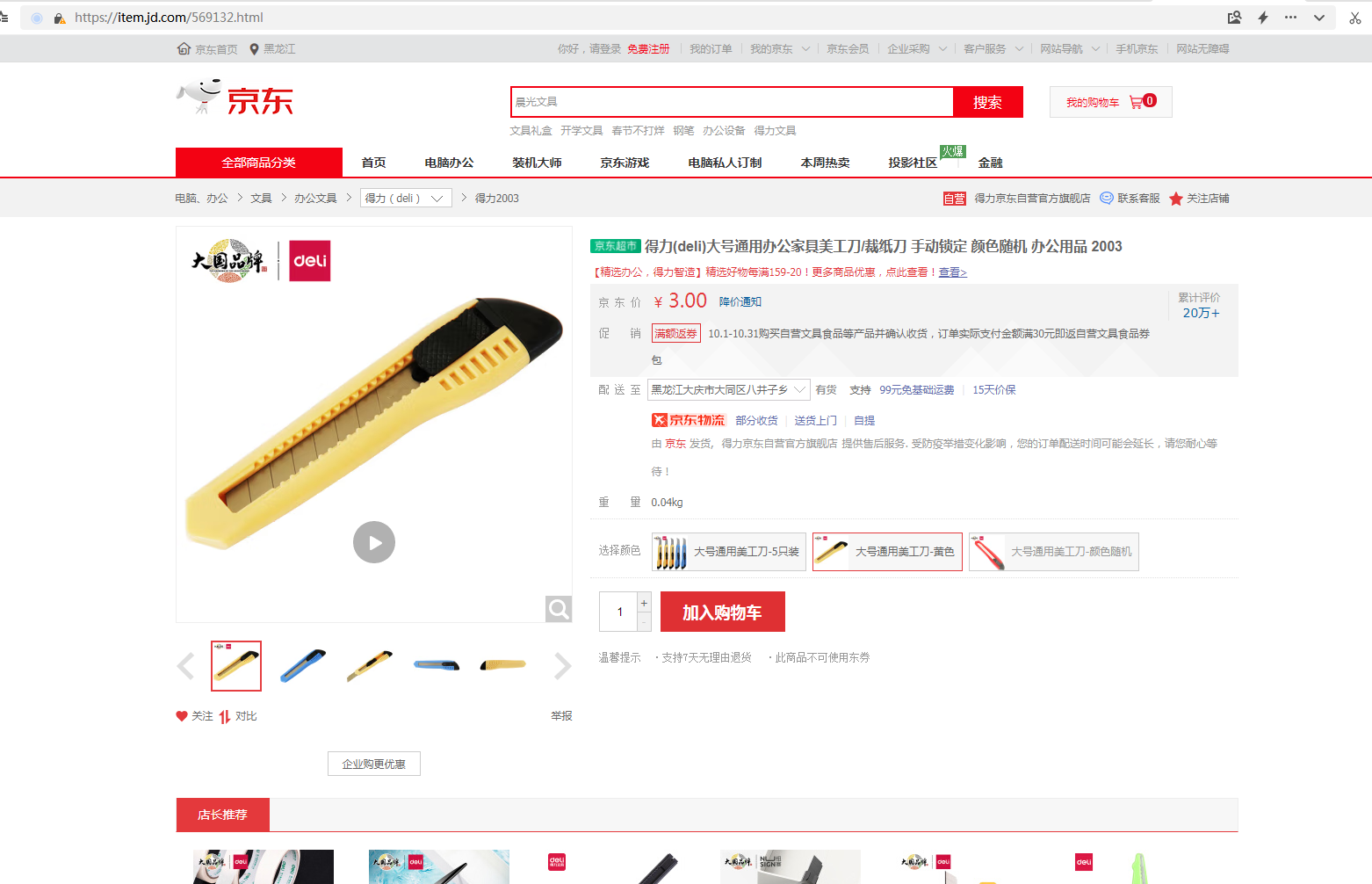 商品名称:得力(deli)大号通用办公家具美工刀/裁纸刀 手动锁定 颜色随机 办公用品 2003