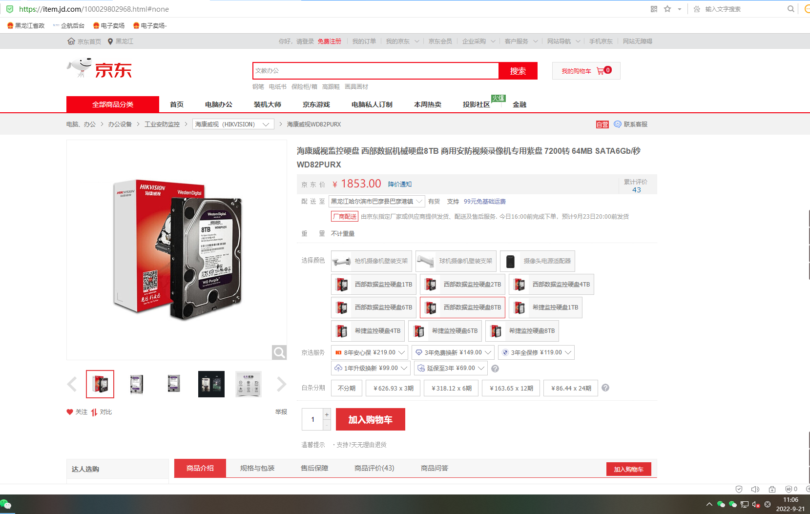 商品名称:海康威视监控硬盘 西部数据机械硬盘8TB 商用安防视频录像机专用紫盘 7200转 64MB SATA6Gb/秒 WD82PURX