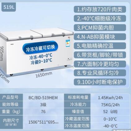 海尔(Haier)家用冰柜商用卧式大容量冷藏冷冻转换零下40度超低温冷柜 顶开门断电保护速冻雪柜 519升 负40度 电子控温 519HEM